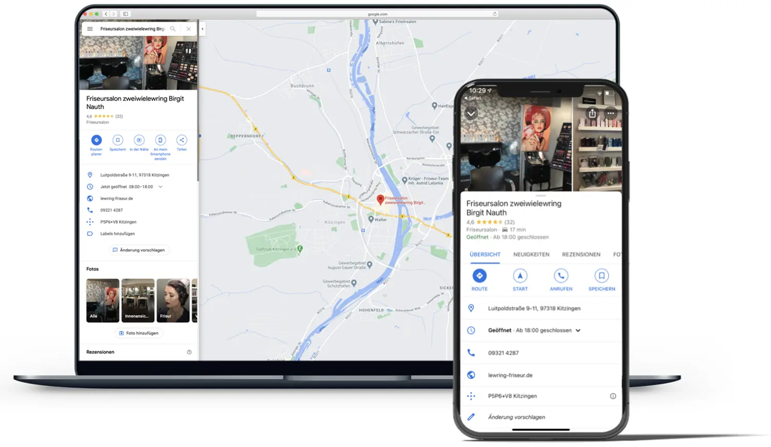 Mit einem Google Unternehmensprofil wird Ihr Unternehmen mit allen relevanten Daten u. a. bei Google Maps und in der Google Suche gefunden. Alle relevanten Informationen stehen schon ohne einen Klick zur VerfĂŒgung.